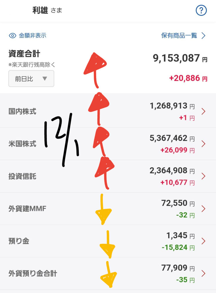 前日比損益+20,886円 ⬆️0円 ➡︎+1,067円 ⬆️+21,953円 ⬆️