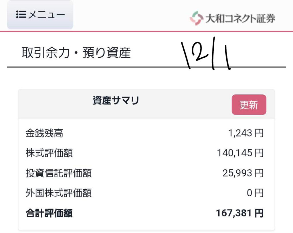 項目楽天証券(前日比)SBI証券(前日比)大和コネクト証券(11/28比)合計(概算)