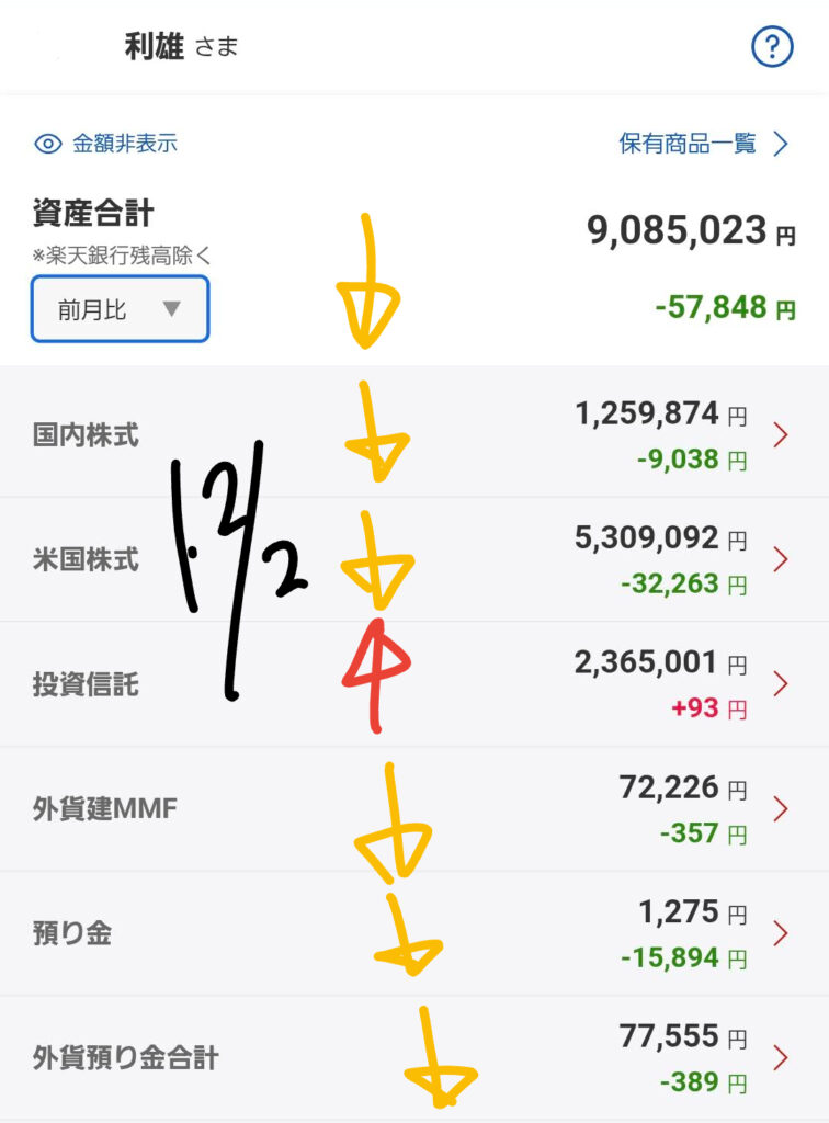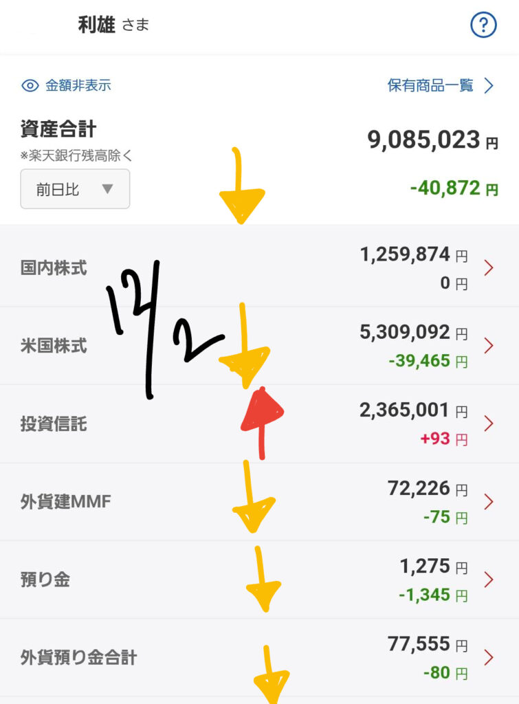 | 資産合計 | 9,085,023円 | -40,872円 | 下落 ⬇️ |