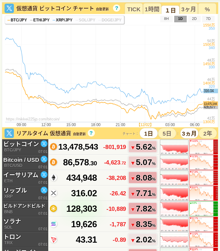 | ビットコイン | 13,478,543円 | -801,919円 (-5.62%) | 大幅に下落 ⬇️ | リスクオフのムードが広がり、仮想通貨市場も大きく売られています。 |