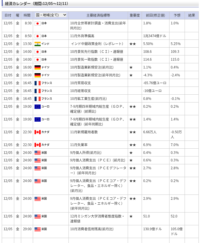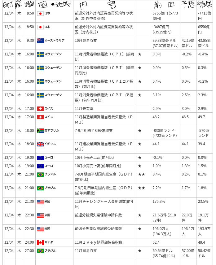 | 16:00 | 11月消費者物価指数(CPI)(前月比) | -0.4% | -0.2% | 0.3% | **CPI(前月比)は予想-0.2%を下回る-0.4%**となり、インフレの勢いは大幅に減速⬇️しました。 |