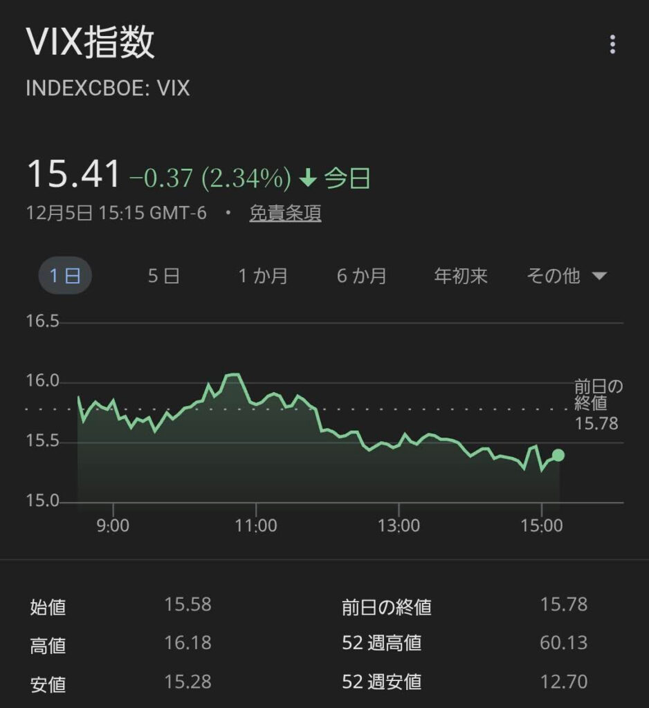 また、市場の不安心理を示すVIX指数(恐怖指数)も、前日終値の15.78から15.41へ低下⬇️し、市場の警戒感が和らいでいることが確認できました。