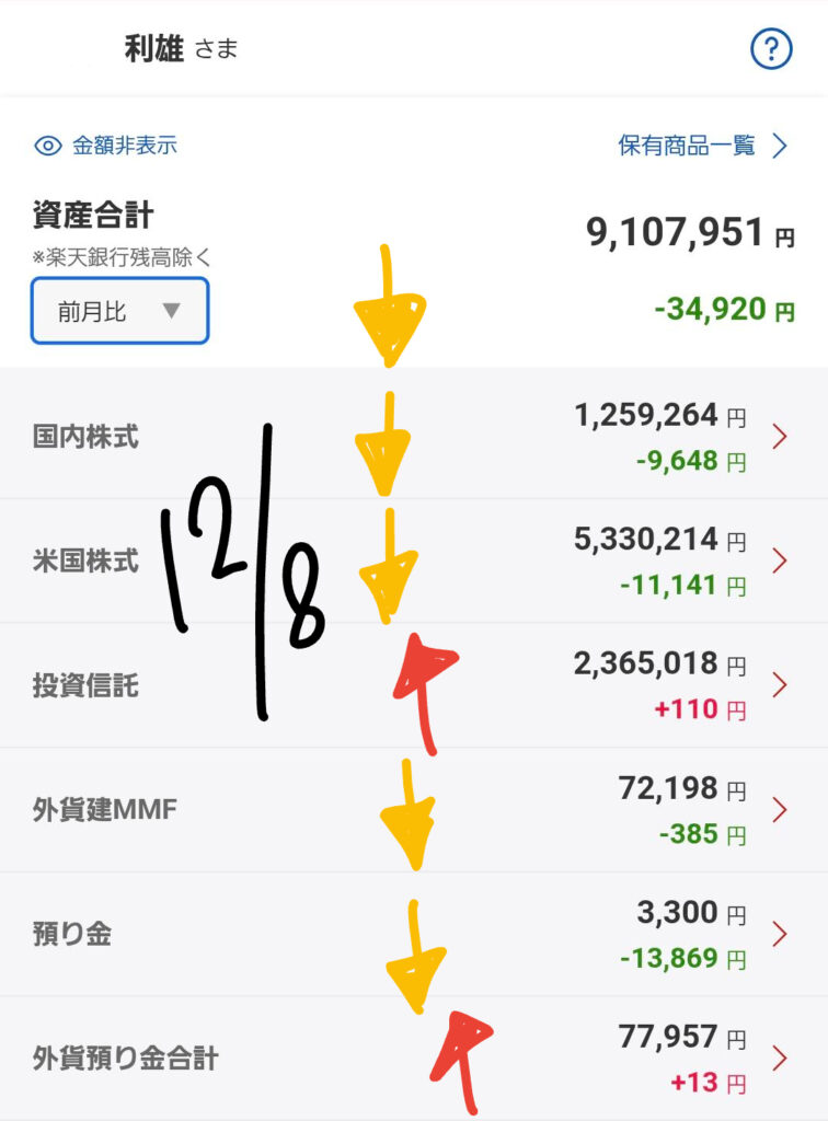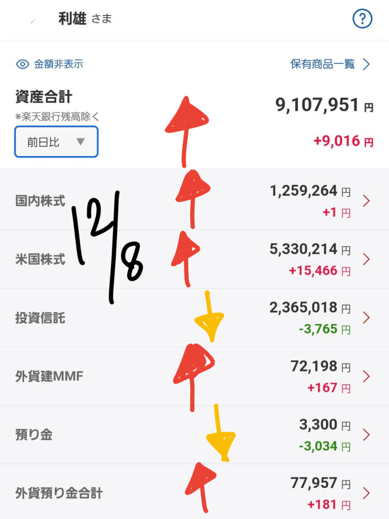 週末を挟んだ比較(12月5日終値比)で、私の主力の楽天証券口座の資産合計は、大幅にプラスでスタートを切ることができました。