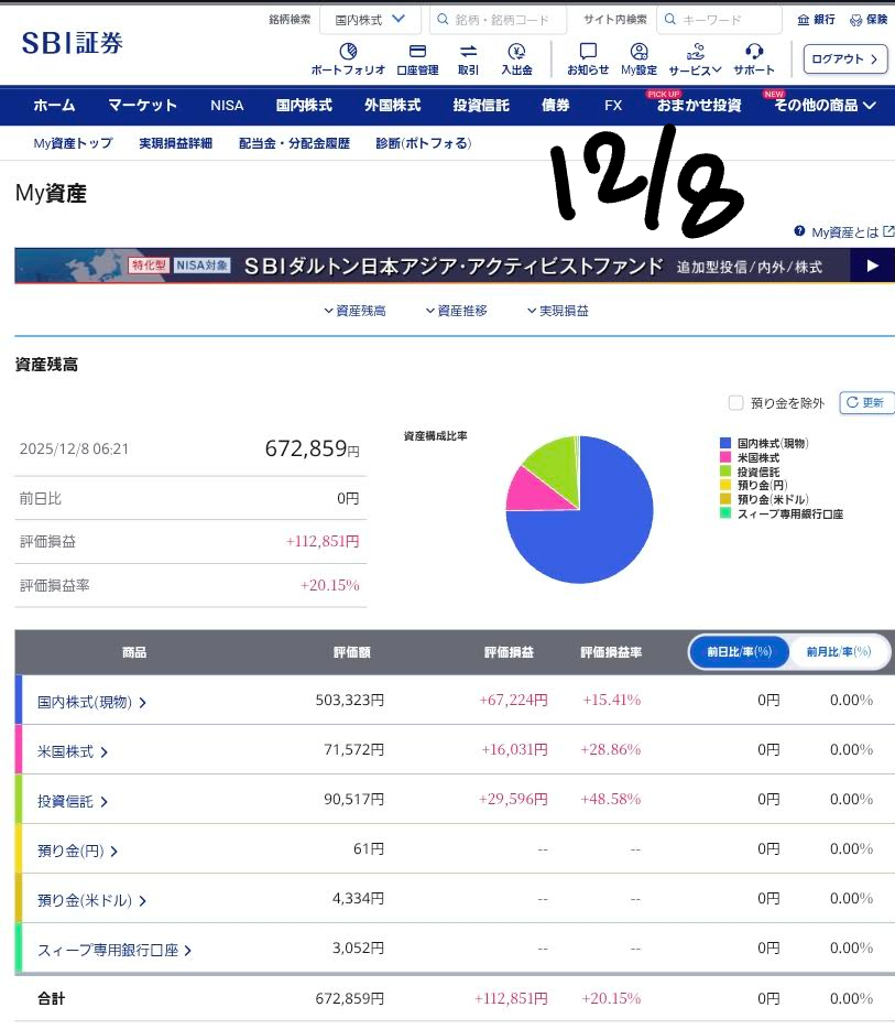 週末を挟みましたが、本日**12月8日(月)**の最新ポートフォリオの状況と、先週末(12月5日)の重要経済指標の結果が、私の資産にどのような影響を与えたのかを詳しく解説していきます。