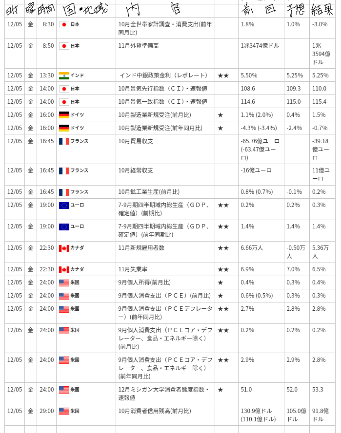 12月5日は、米国の重要インフレ指標であるPCE、日本の消費動向、そしてカナダの雇用統計など、広範囲な指標が発表されました。