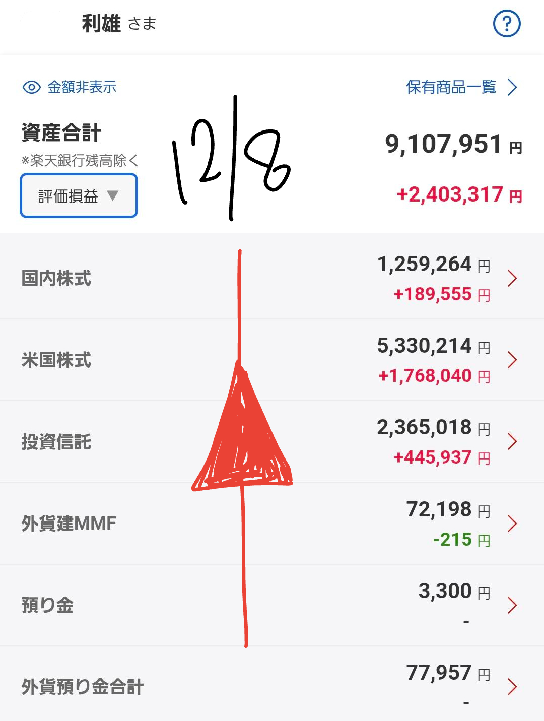 週末を挟んだ比較(12月5日終値比)で、私の主力の楽天証券口座の資産合計は、大幅にプラスでスタートを切ることができました。