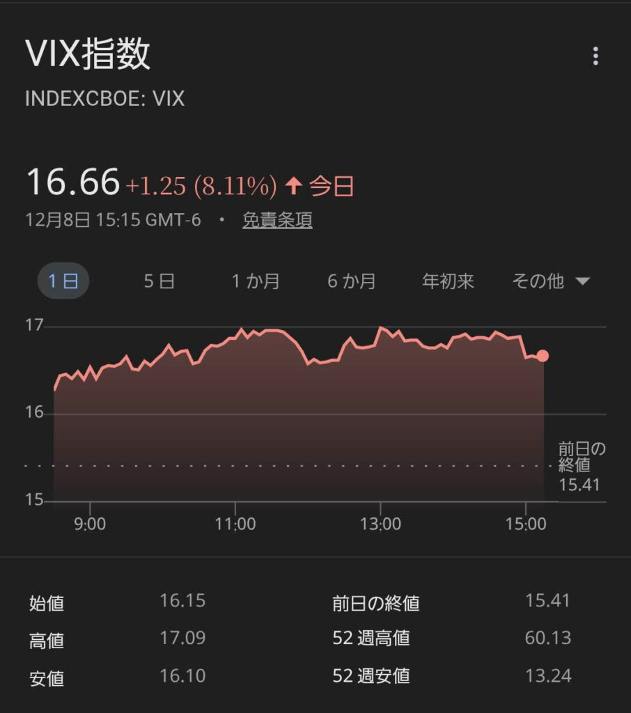 市場の警戒心を示すVIX指数は、前日終値の15.41から16.66へ大きく上昇⬆️しました。これは、日本のGDP改定値や、今週のFOMC(米連邦公開市場委員会)を前に、投資家がリスクを警戒し始めたサインだと見ています。