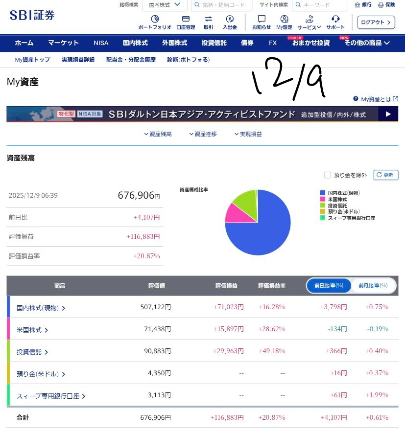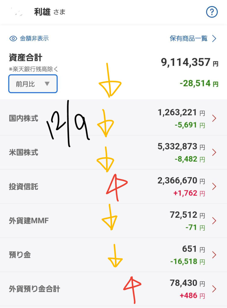 昨日(12月8日終値)と比較し、私の資産合計は堅調に推移しました。
