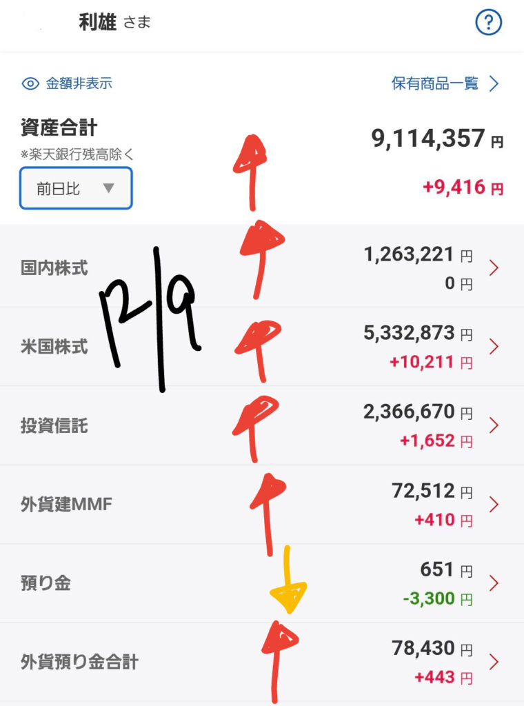 主力の楽天証券口座の資産合計は、+9,416円と大きくプラス⬆️となり、911万円台を回復しました。