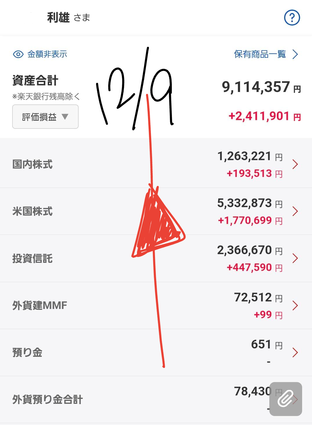 昨日(12月8日終値)と比較し、私の資産合計は堅調に推移しました。
