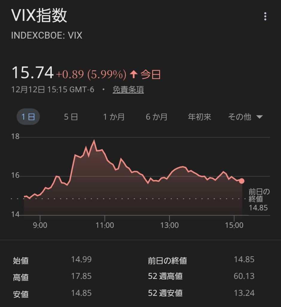 - VIX指数(恐怖指数)が大幅に上昇し、5.99%増の15.74となりました ⬆️。これは、市場参加者の間に不安や警戒感が高まったことを示しています。