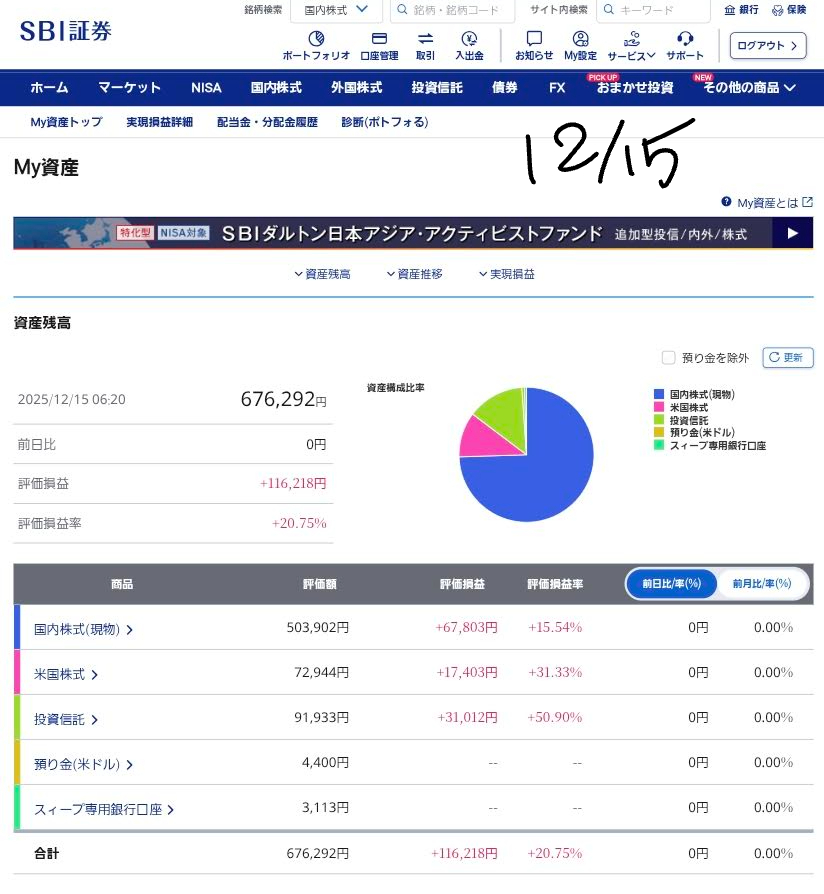 💰 1. ポートフォリオ全体の状況(12/15時点)