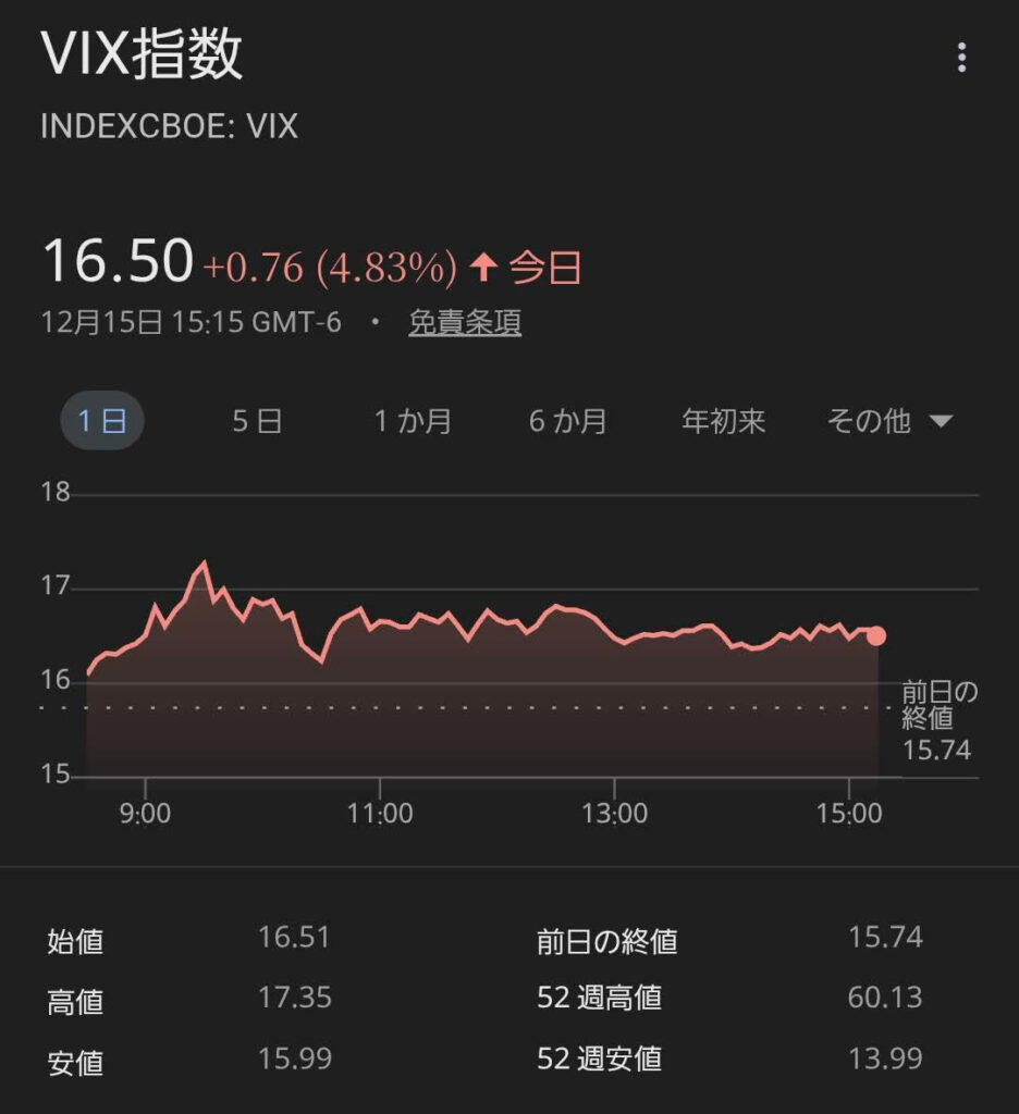 - VIX指数(恐怖指数)は16.50と、前日比で4.83%も上昇 ⬆️しました。