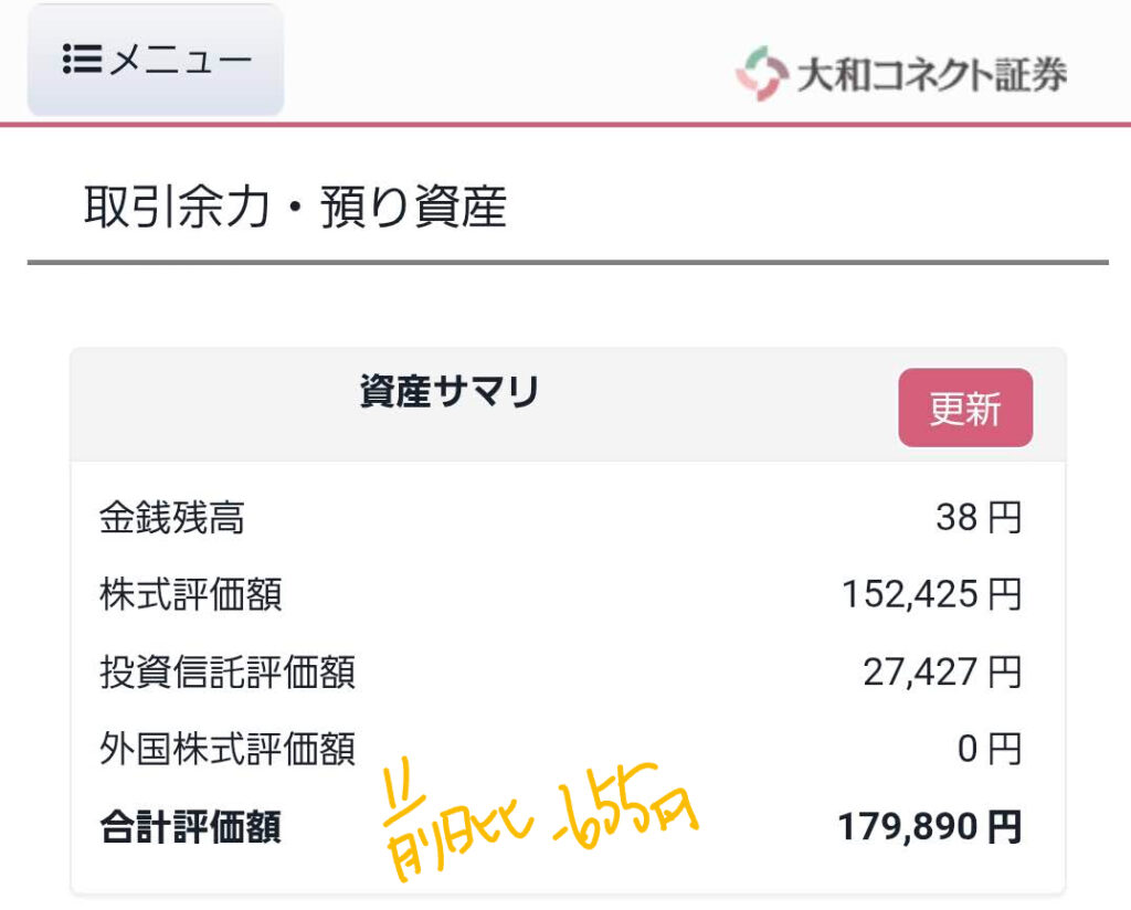これは、昨晩の米国市場の下落がダイレクトに影響した結果です。投資信託も米国株や外国株を多く含むため、連動して評価額が下がっています。