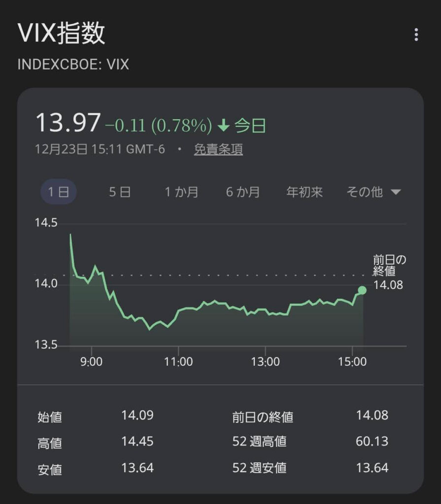 • VIX指数の動向: 現在のVIX指数(恐怖指数)は13.97と落ち着いています。投資家心理は安定していますが、逆に言えば急なサプライズには弱い状態とも言えます。