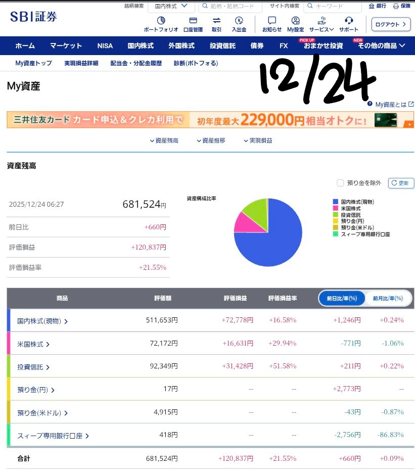 本日は2025年12月24日時点のリアルな資産運用状況を、昨日の市場動向とあわせて詳しく公開いたします。