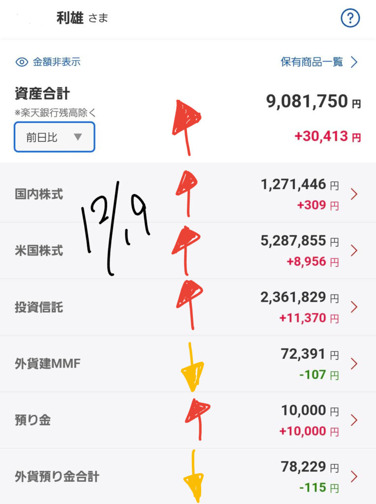 昨日は国内株・米国株ともに堅調に推移し、資産合計はプラスで終了しました。