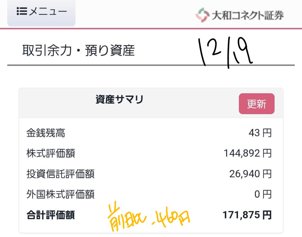 • 日経平均:昨日時点では49,001.50円と軟調な場面もありましたが、私の保有する**国内株式は前日比でプラス(+309円)**を確保しました。