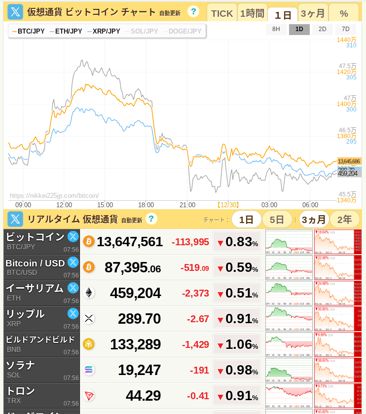 - 仮想通貨市場: ビットコインは 13,647,561円(-0.83%) ⬇️ と、やや軟調な推移となりました。