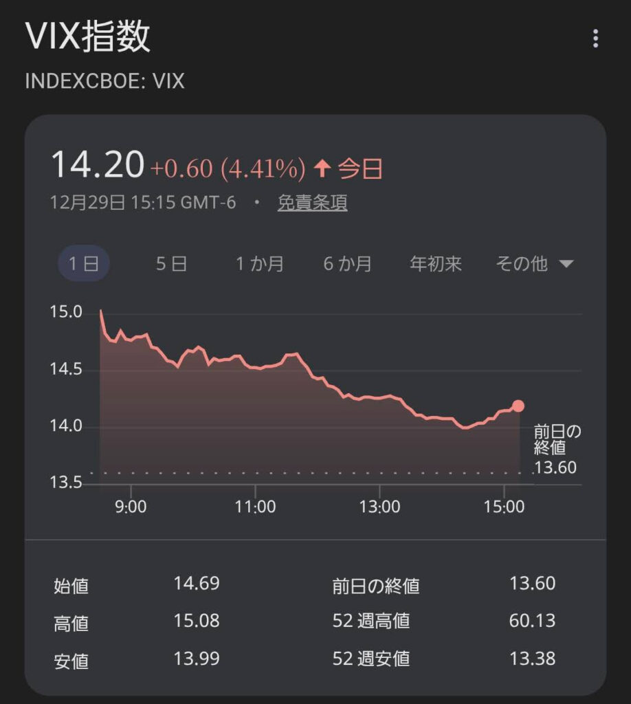 - VIX指数(恐怖指数): 14.20(+4.41%) ⬆️ と上昇しており、年末の市場にやや警戒感が漂っています。