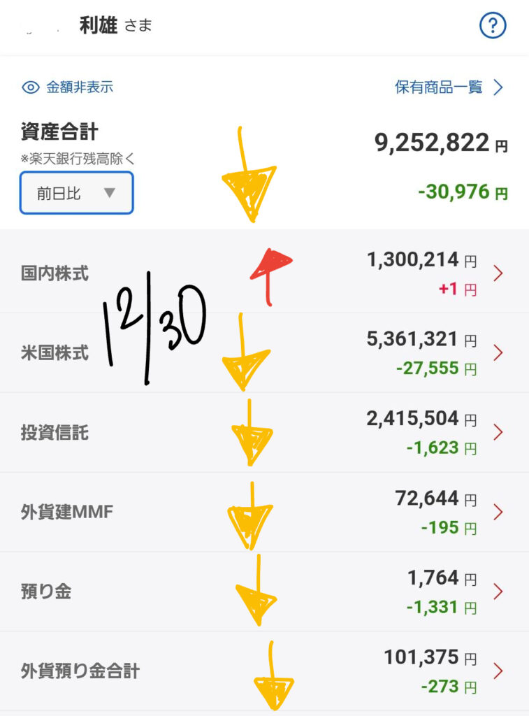 昨日は米国市場の調整や為替の影響を受け、資産全体では -30,976円 ⬇️ の減少となりました。特に米国株式のマイナスが目立ちますが、これは住宅指標の強弱が入り混じった結果、利益確定売りが出た影響と考えられます。