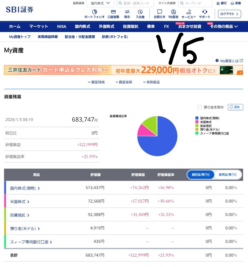 日本の市場は三が日の休場明けを待つ状態であり、現時点での評価額に大きな動きはありません。しかし、ドル円相場(156.73円)の動きや緊迫する南米情勢を受け、本日5日の「大発会」では波乱含みの展開が予想されます。