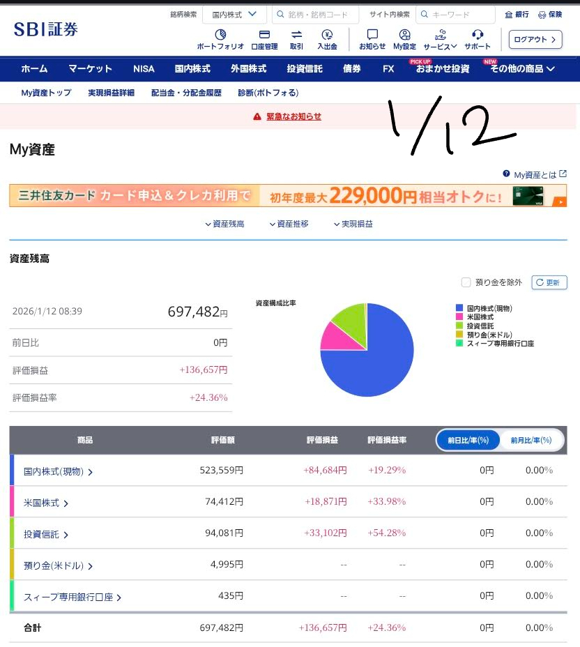 2026年1月12日現在の私のポートフォリオ状況と、今後の見通しについてまとめました。WordPressへの入稿にご活用ください。