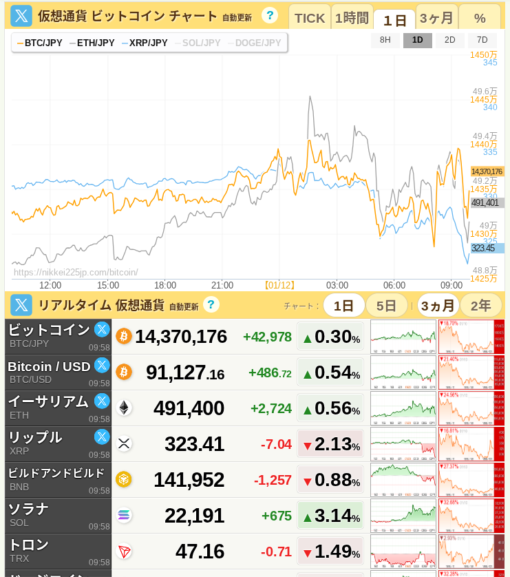 • ビットコイン(BTC): 約14,370,176円(+0.30%) ⬆️