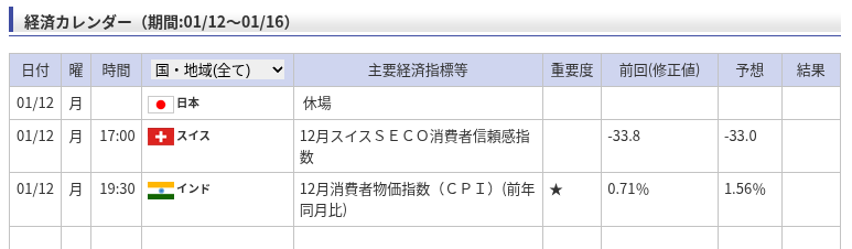 3. 経済カレンダーの確認: 本日は日本市場が休場ですが、スイスの消費者信頼感指数やインドのCPI発表が控えています。グローバルなインフレ動向が、週後半の市場にどう影響するか注目しています。