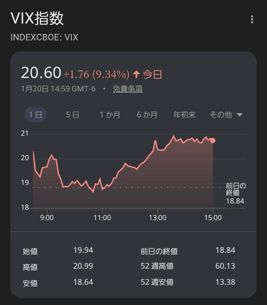 株価が下落する一方で、ボラティリティ(価格変動の激しさ)を示すVIX指数が20を超えて急上昇しており、市場に警戒感が広がっています。私の米国株評価額が下がったのも、この全体的な株安が直撃した形です。