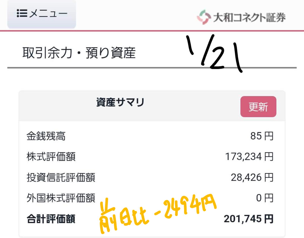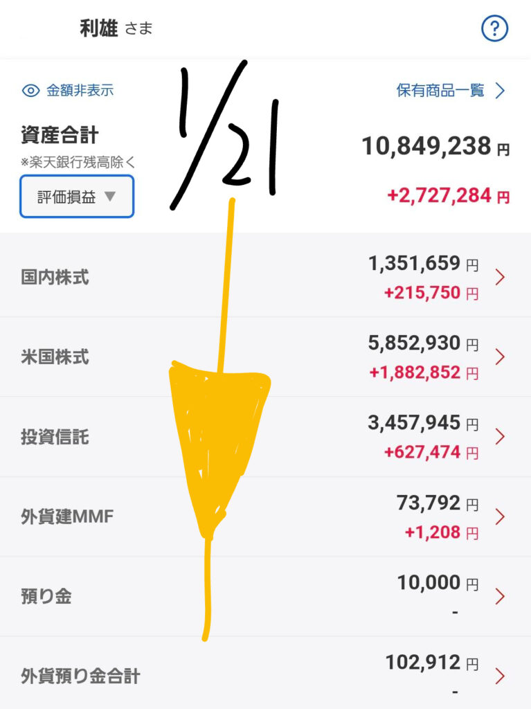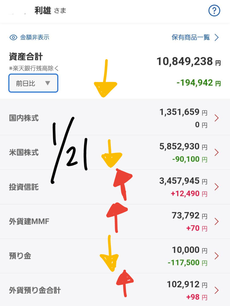 昨日(1月20日)から本日(1月21日)にかけての、私のメイン口座における運用実績をご報告します。