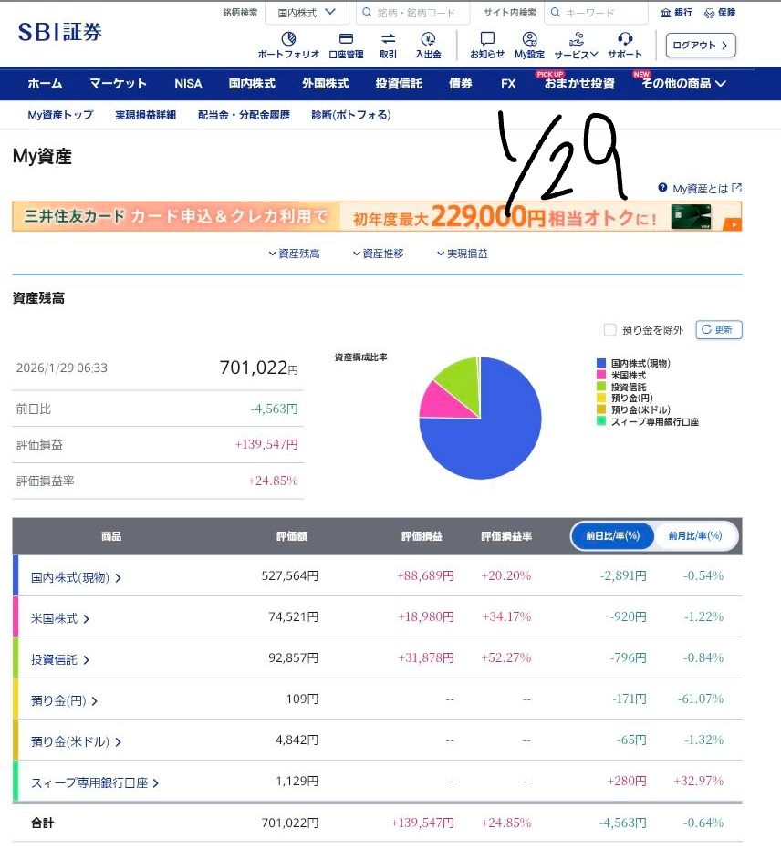 本日は1月29日時点の私の資産状況と、昨日のマーケットの動きを振り返りながら、今後の見通しについて詳しくお伝えします。