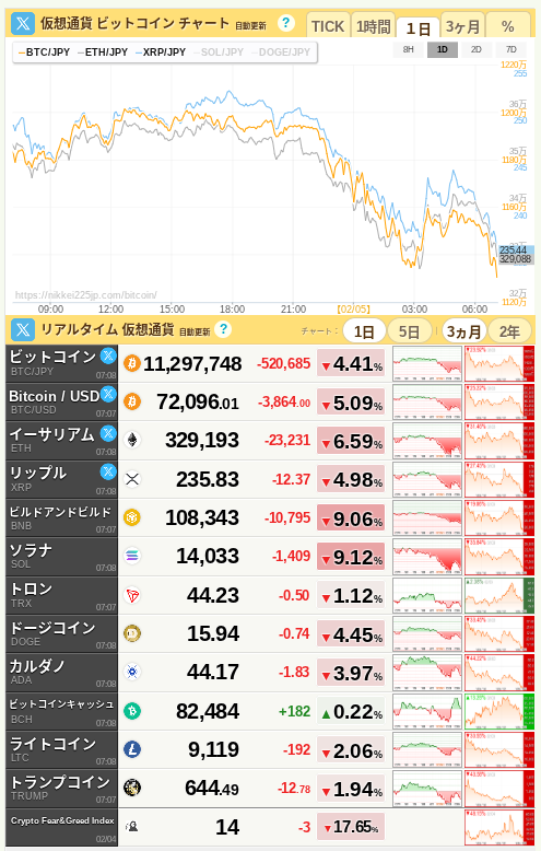 暗号資産市場ではビットコインが前日比で約4%以上下落し、11,297,748円付近まで押し戻されています。また、恐怖指数(VIX)も18.64(+3.56%)に上昇しており、投資家が「現金や安全資産」へ資金を避難させている様子が伺えます。