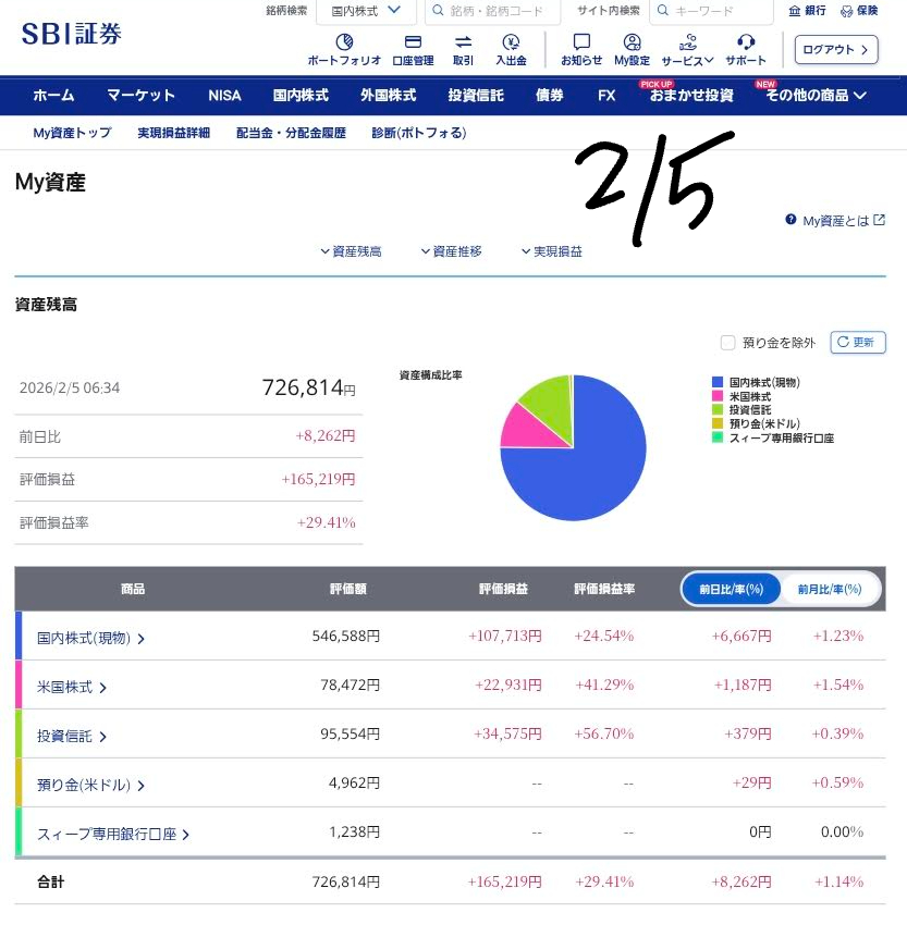 2026年2月5日現在の資産状況です。マーケットのボラティリティ(変動)が激しくなっています。