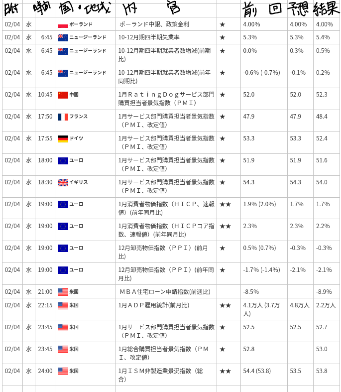 米国の1月ADP雇用統計は、市場予想の4.8万人を大きく下回る2.2万人という結果になりました。労働市場の冷え込みが強く示唆されています。一方で、ISM非製造業景況指数は予想を上回り、サービス部門の力強さは維持されているという、強弱入り混じる結果となりました。