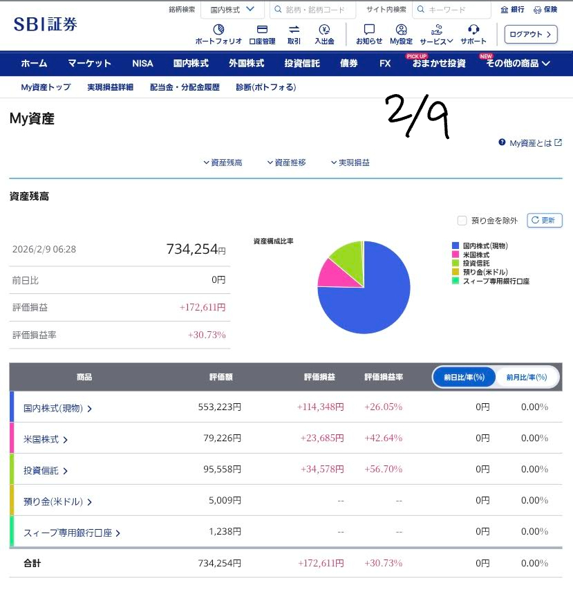 【2026年2月9日】ポートフォリオ現状分析:米株・ビットコインが牽引する資産推移