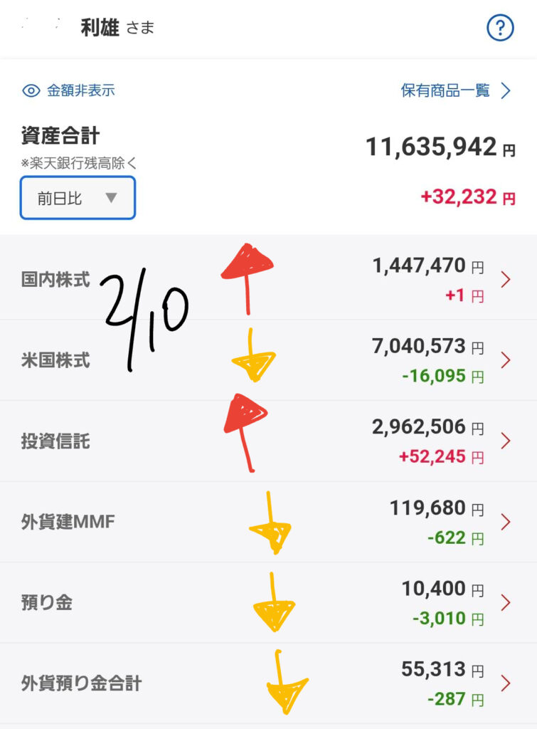• 投資信託: 前日比で +52,245円 と大きく伸長しました ⬆️。日経平均の急騰がダイレクトに寄与しています。