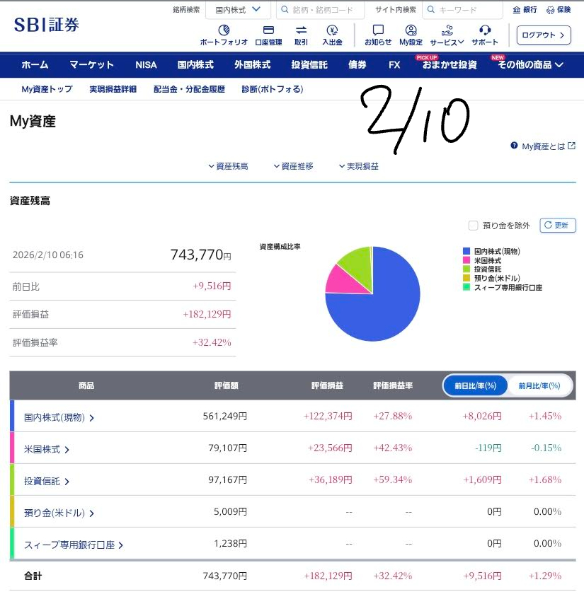 本日は、2026年2月10日時点の私の資産状況と、昨日の市場動向を踏まえた今後の展望についてお伝えします。