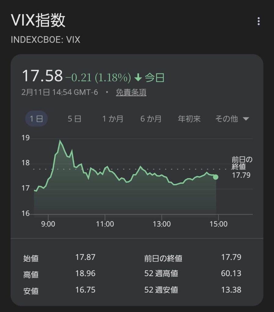 ■VIX指数 17.65 (前日比:⬇️ ※前日終値17.79比) https://finance.yahoo.com/quote/%5EVIX/