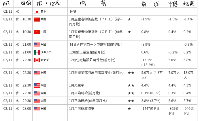 | 02/11 | 【中】1月生産者物価指数(PPI) | -1.4% | -1.5% | -1.9% |