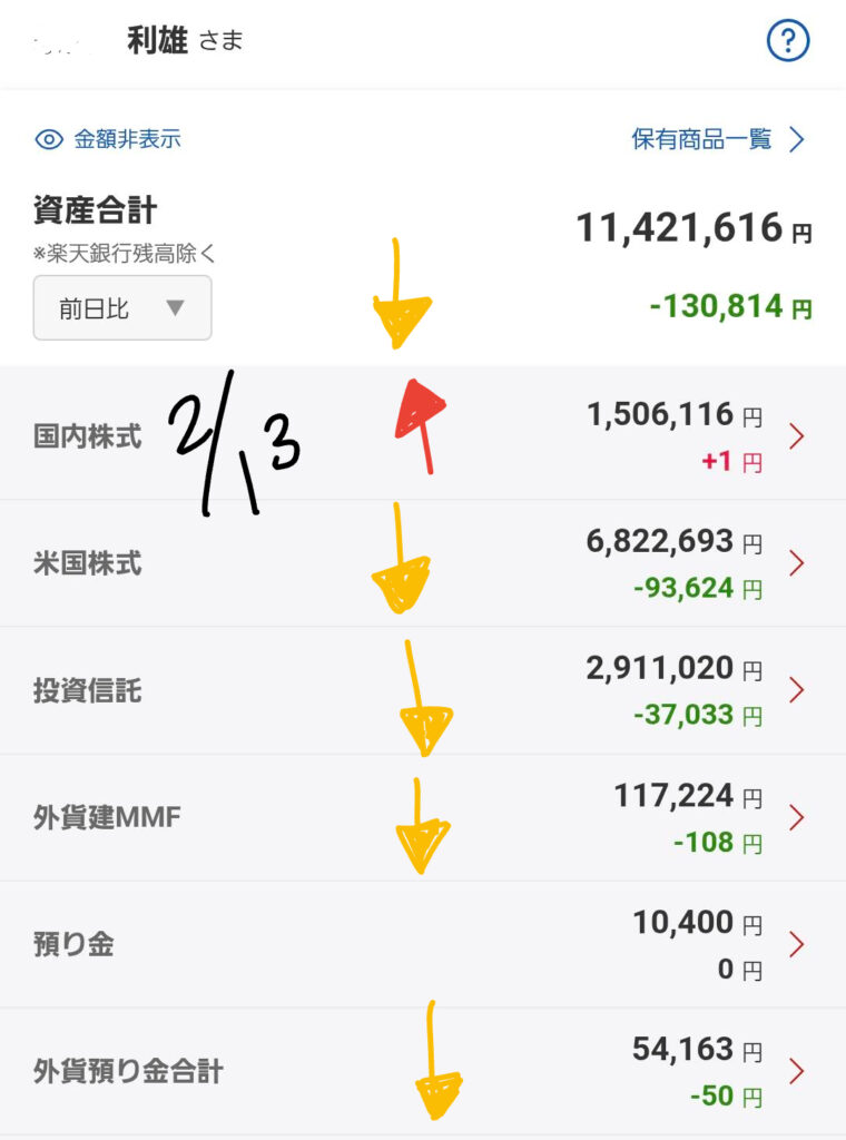 - 資産合計: 11,421,616円 ⬇️(前日比 -130,814円)