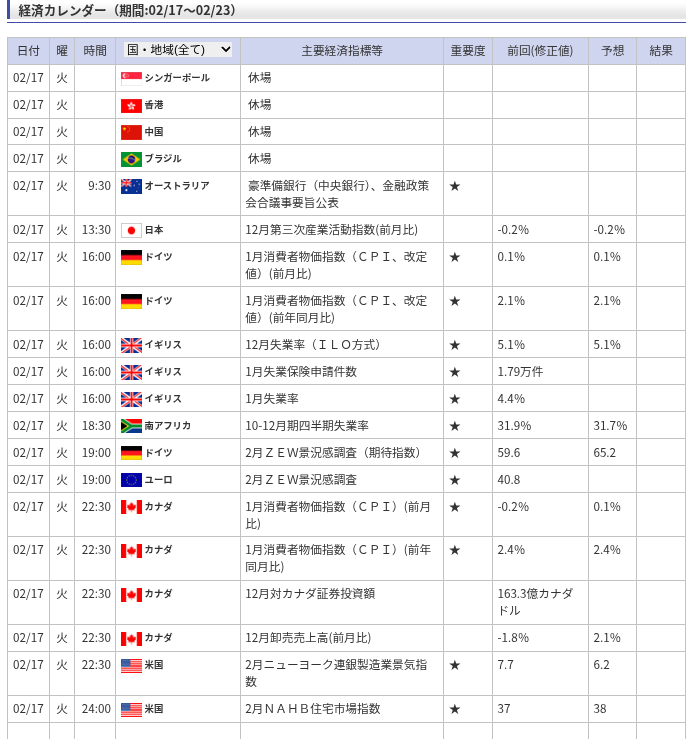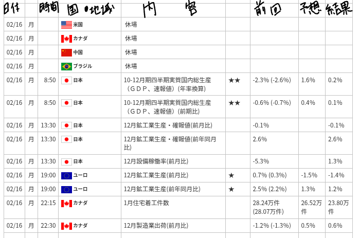 2月16日は米国市場が休場であったため、全体的に取引は限定的でしたが、日本のGDP速報値の伸び悩みが目立つ一日となりました。景気回復のペースが予想より遅いことが浮き彫りになり、今後の日銀の政策判断にも影響を与える可能性があります。また、ユーロ圏の鉱工業生産も芳しくなく、世界的に製造業の停滞感が意識される内容でした。