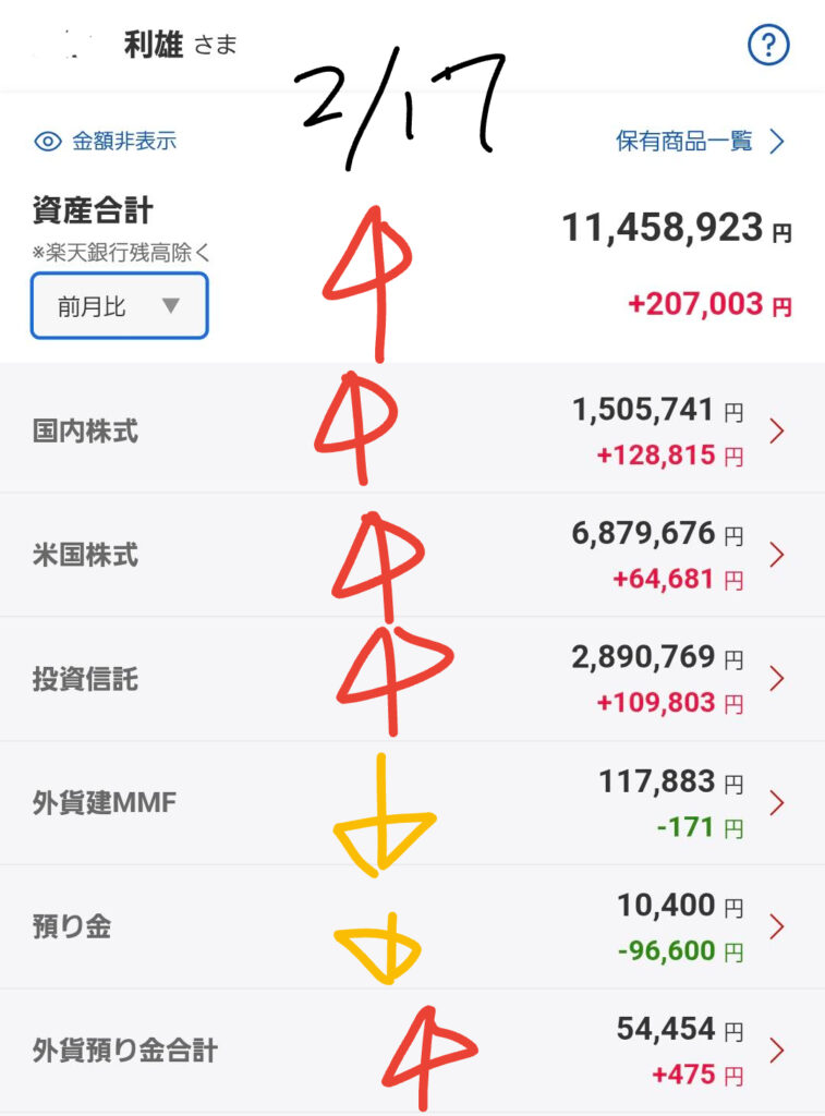 - メインの楽天証券口座では、米国株と投資信託が資産を押し上げました。国内株は昨日の値動きが相殺され、横ばいの着地となっています。