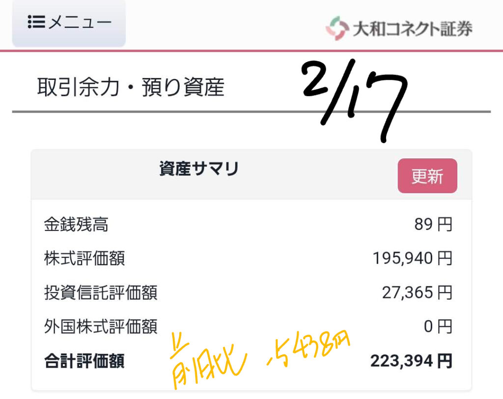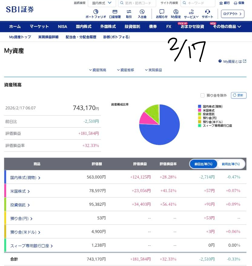 - 資産残高:前日比 -2,510円 ⬇️ SBI証券では国内株式(現物)の比率が高いため、日経平均の軟調な動きを受けて、わずかに前日比マイナスとなりました。