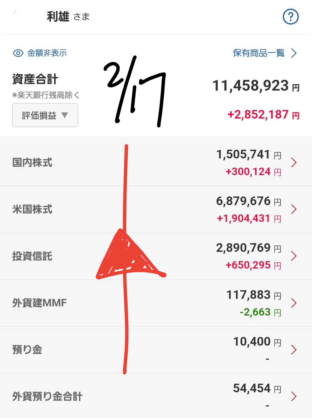 - メインの楽天証券口座では、米国株と投資信託が資産を押し上げました。国内株は昨日の値動きが相殺され、横ばいの着地となっています。