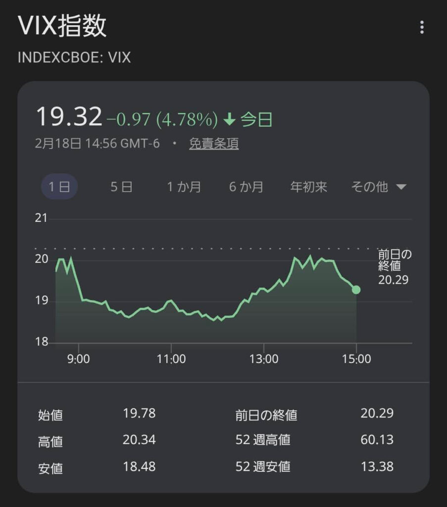VIX指数: 19.62 (前日比: ⬇️ -0.67 / -3.30%)