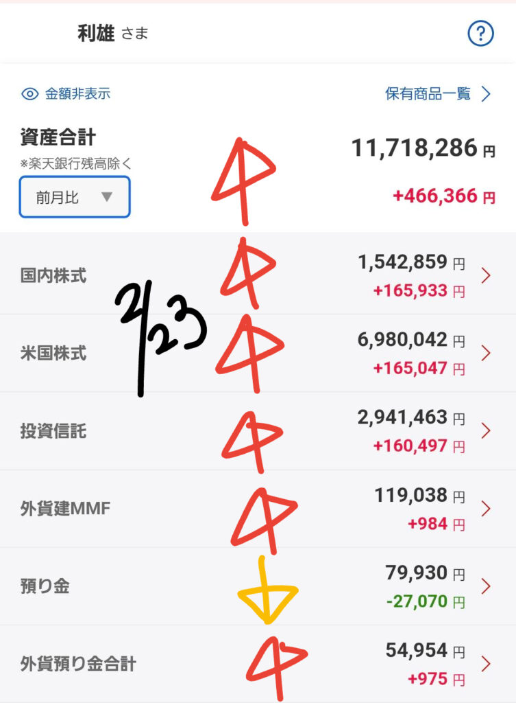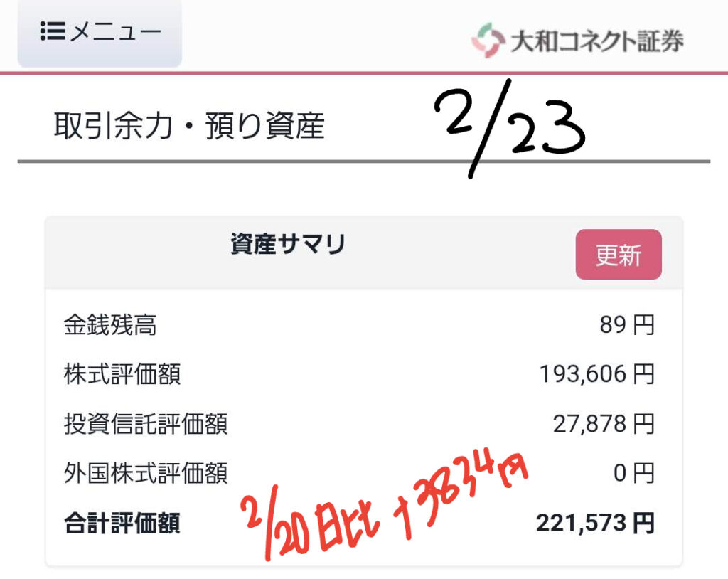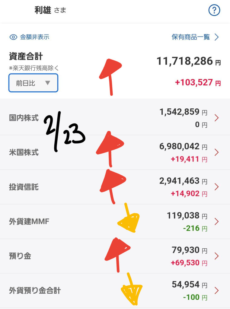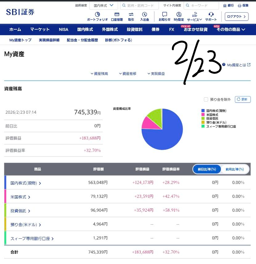 2月23日早朝時点の集計では、資産合計は前日から約10万円のプラスとなりました。楽天証券、SBI証券、大和コネクト証券の各口座を合算した状況ですが、全体として堅調な推移を見せています。