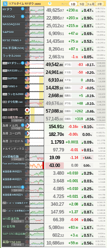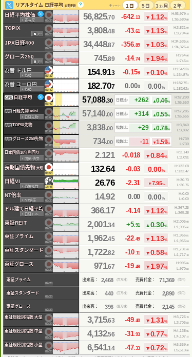 - 前日比:0 円(市場休場のため動きなし)本日の日本市場は天皇誕生日の振替休日のため休場です。そのため、国内株の評価額に変動はありません。しかし、シカゴ市場(CME)の日経平均先物が 57,145円(⬆️) と強く推移しているため、連休明けの明日の動きには非常に期待が持てる状況です。