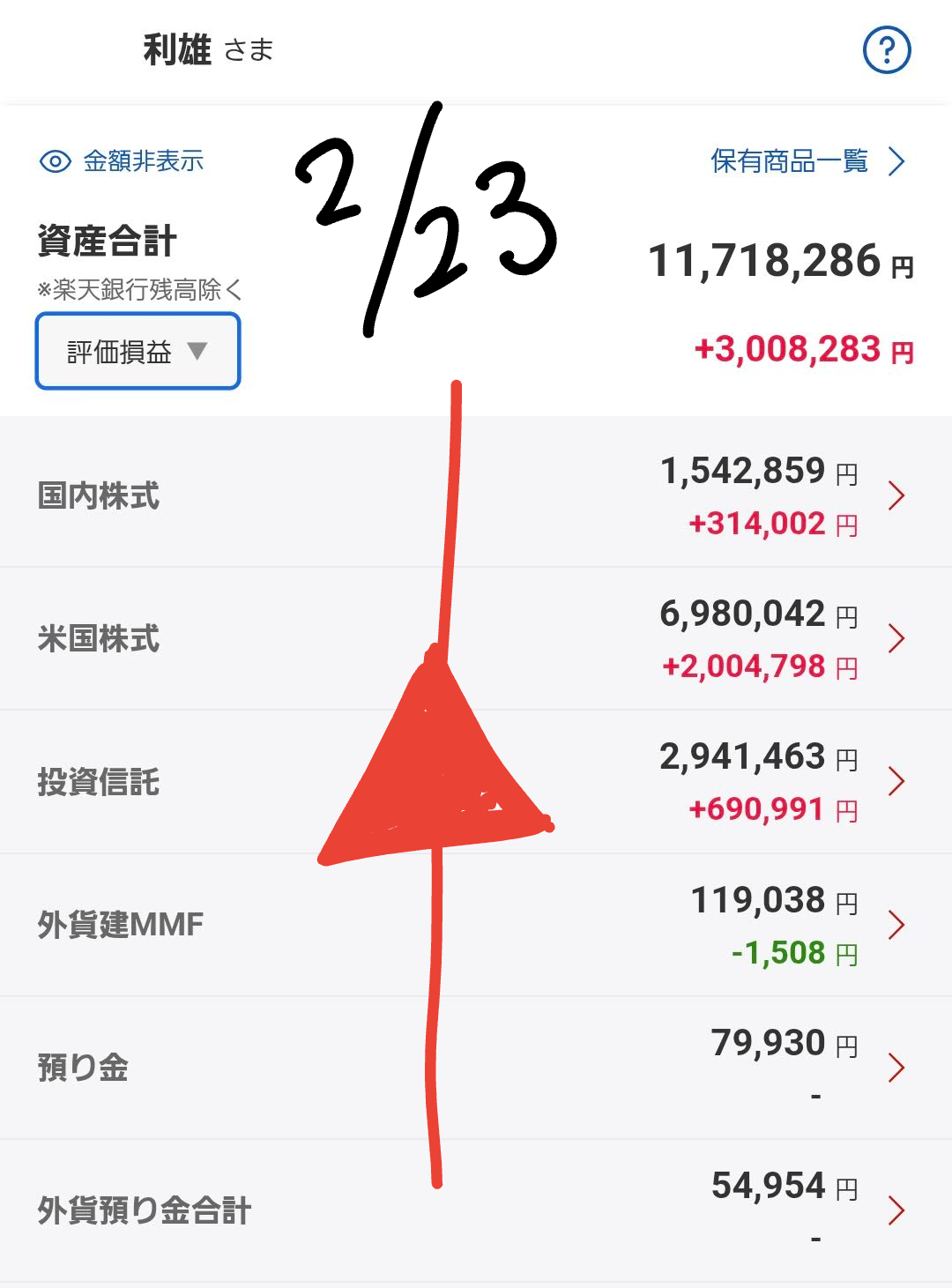 2月23日早朝時点の集計では、資産合計は前日から約10万円のプラスとなりました。楽天証券、SBI証券、大和コネクト証券の各口座を合算した状況ですが、全体として堅調な推移を見せています。