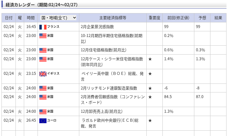 - 経済カレンダーの注視:今夜(2月24日 24:00)には、米国の「2月消費者信頼感指数」の発表が控えています。この結果次第で市場のムードが反転する可能性があるため、注視が必要です。